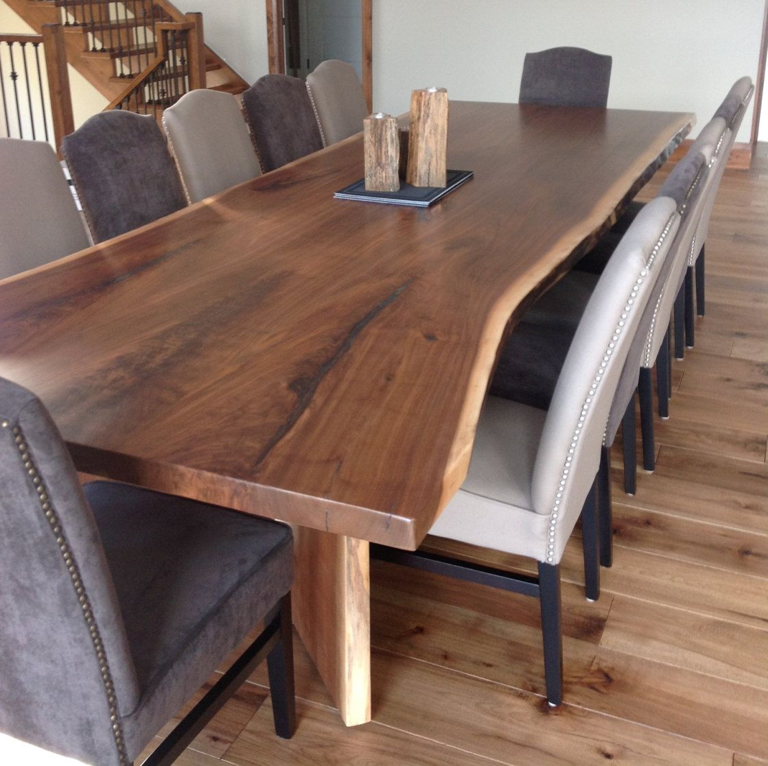 This Walnut table is created from a solid peice of Estern black walnut. Dimensions are 120" X 42" x 4" thickness. This table will be a family heirloom for generations to come. The excellent craftsmanship is evident from any agle and will seat 12comfortably but can accomodate a few more friendly family members in a squeeze. Walnut has been the prefered wood of royalty for centuries because of its beautiful grain and durability. Not many hard wood furniture possesses more elegance and exquisite beauty